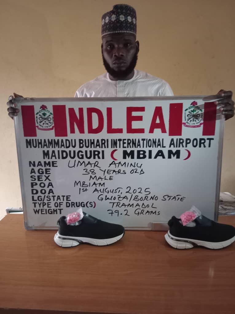 In Borno state, NDLEA operatives at the arrival hall of the Muhammadu Buhari International Airport (MBIAM) Maiduguri on Friday 1st August intercepted a consignment of 160 pills of tramadol concealed in footwears by a 38-year-old passenger, Umar Aminu who was promptly arrested.