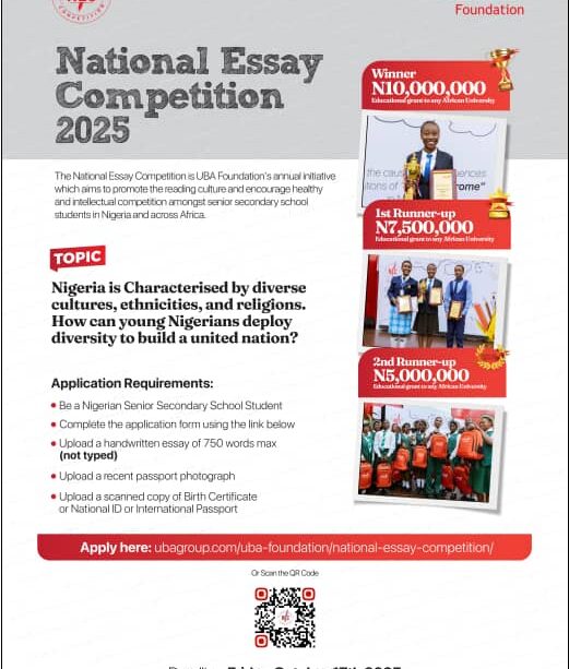 To be eligible, participants must be Nigerian students in senior secondary school and are required to submit scanned copies of their handwritten essays (not more than 750 words), a recent passport photograph, and a copy of their birth certificate, National ID, or international passport via the dedicated portal on the UBA Foundation’s official website.